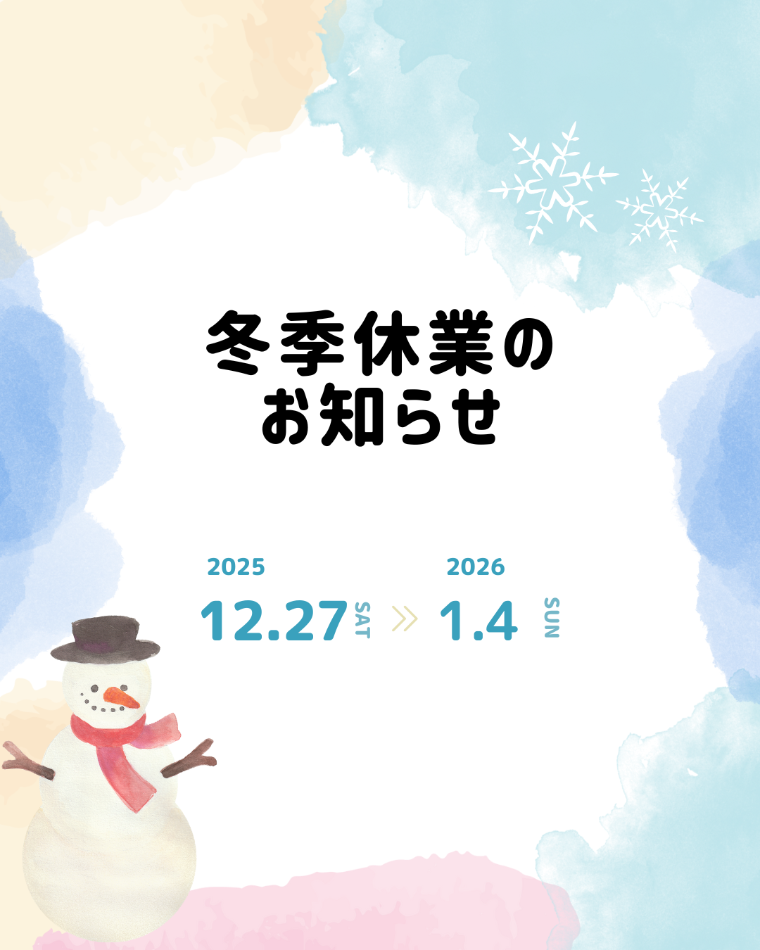 いつもありがとうございます!12月27日(土)~1月4日(日)は弊社冬季休業とさせて頂きます。ご不便をおかけしますが、宜しくお願い致します。尚、お問い合わせについては休業明けに順次対応させて頂きます。皆様におかれましても素敵な夏をお過ごしください
