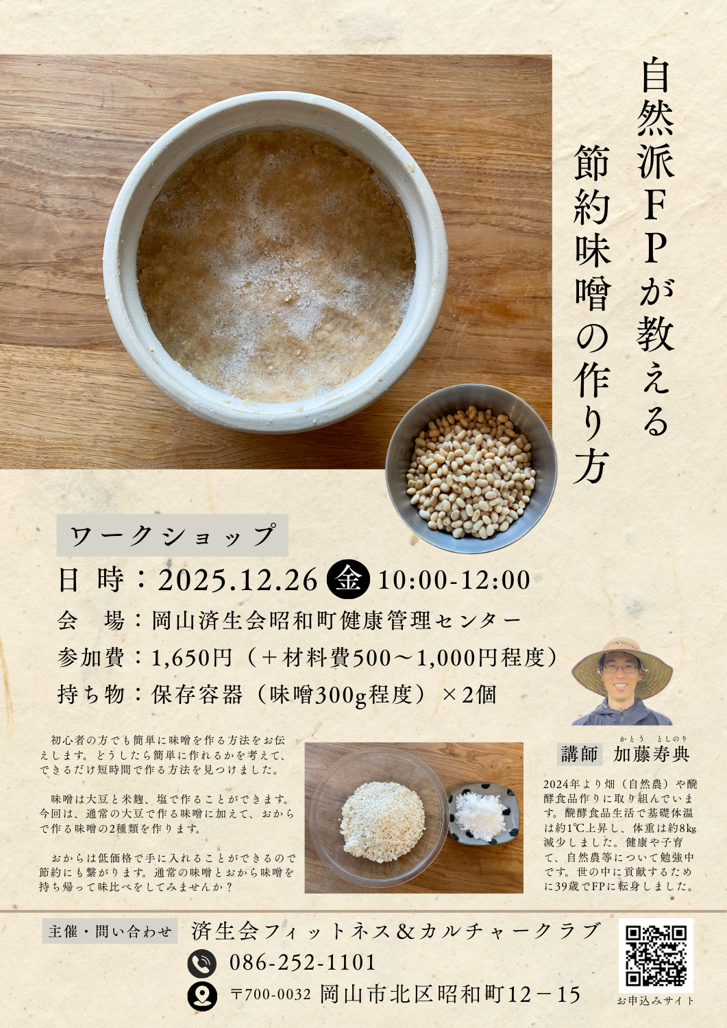 12月26日(金)に済生会フィットネス&カルチャークラブで味噌づくりのワークショップを開催することになりました。自分で味噌をつくることによって、物価高騰の中でも食費を抑えることができます。材料を選ぶことで市販の味噌よりおいしくつくることもできます。是非ご参加いただけたらと思います。